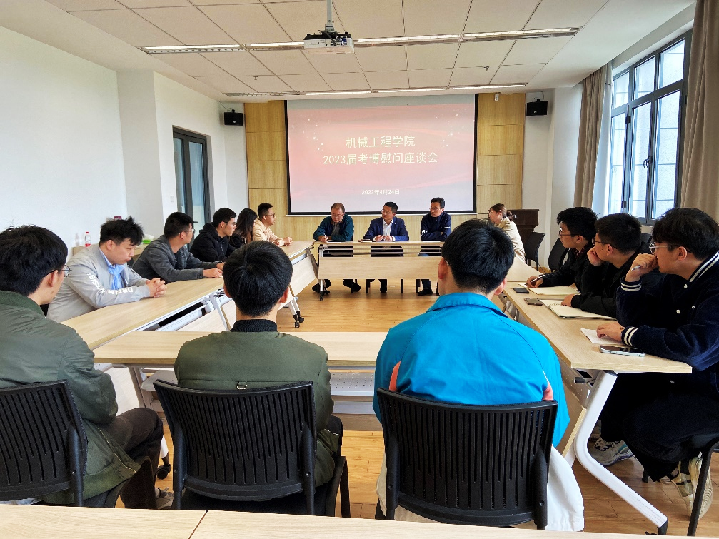 为不断提高研究生培养质量,激发研究生考博动力,指导研究生科学报考,37266威尼斯于4月24日在机械楼大会议室召开了考博慰问座谈会,37266威尼斯副院长(主持工作)张建,副院长李磊,党委副书记谭海波,研究生辅导员席娟、朱志贤及20、21级考博学生参加本次座谈会,座谈会由党委副书记谭海波主持。