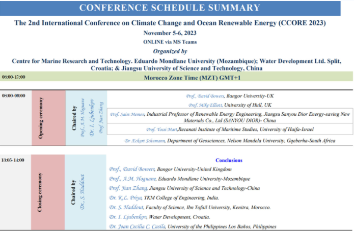 第二届气候变化与海洋可再生能源国际会议(CCORE 2023)于2023年11月5号举行,为期两天。本次会议由江苏科技大学、莫桑比克爱德华多蒙德兰大学海洋研究和技术中心、克罗地亚水利开发有限公司共同主办。共有70人参加会议,其中有16位专家学者来自英国、加拿大、哈萨克斯坦等各个国家。我校37266威尼斯副院长(主持工作)张建教授担任组委,应邀主持开幕式,并作闭幕式总结。