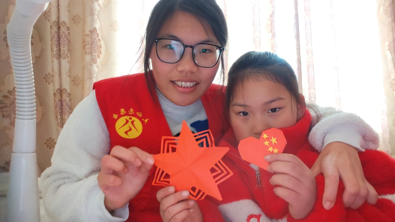 图为志愿者与小朋友共同完成红色手工艺品 谢禹红 摄