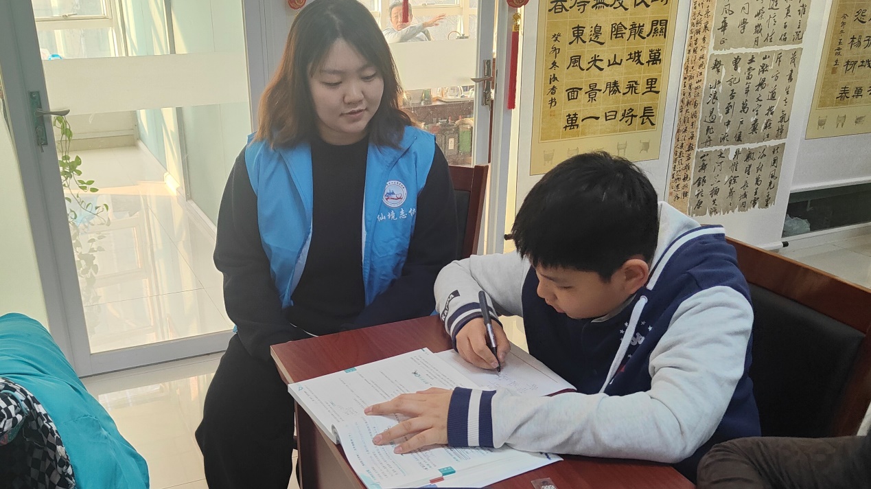 图为志愿者为小学生进行课业辅导 吴颖颖摄