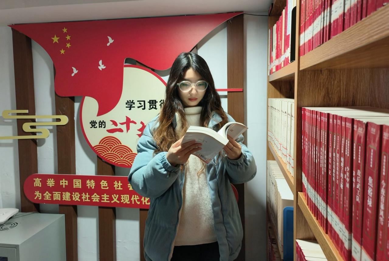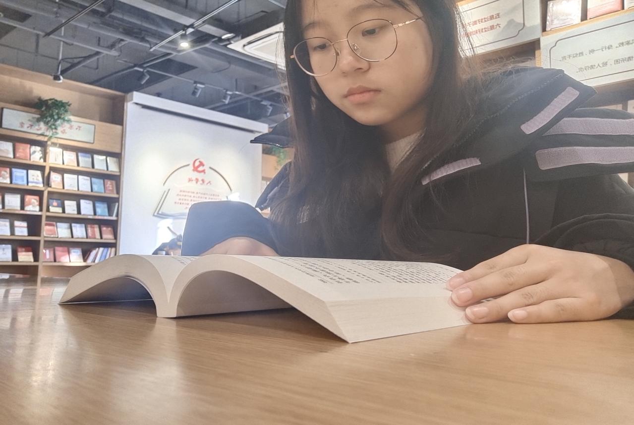 图为刘棵和邹欣妍在阅读学习红色书籍