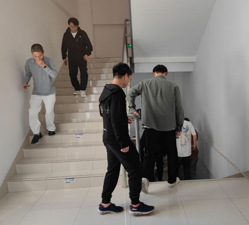 本次演练模拟机械楼5层某处发生火灾,伴随消防警报的响起,全体师生按照预先设定的疏散路线,短时间内有序从各办公室、各实验室撤离至安全区域。在疏散过程中,表现出良好的组织纪律性和团队协作精神,未出现慌乱和拥挤的情况。