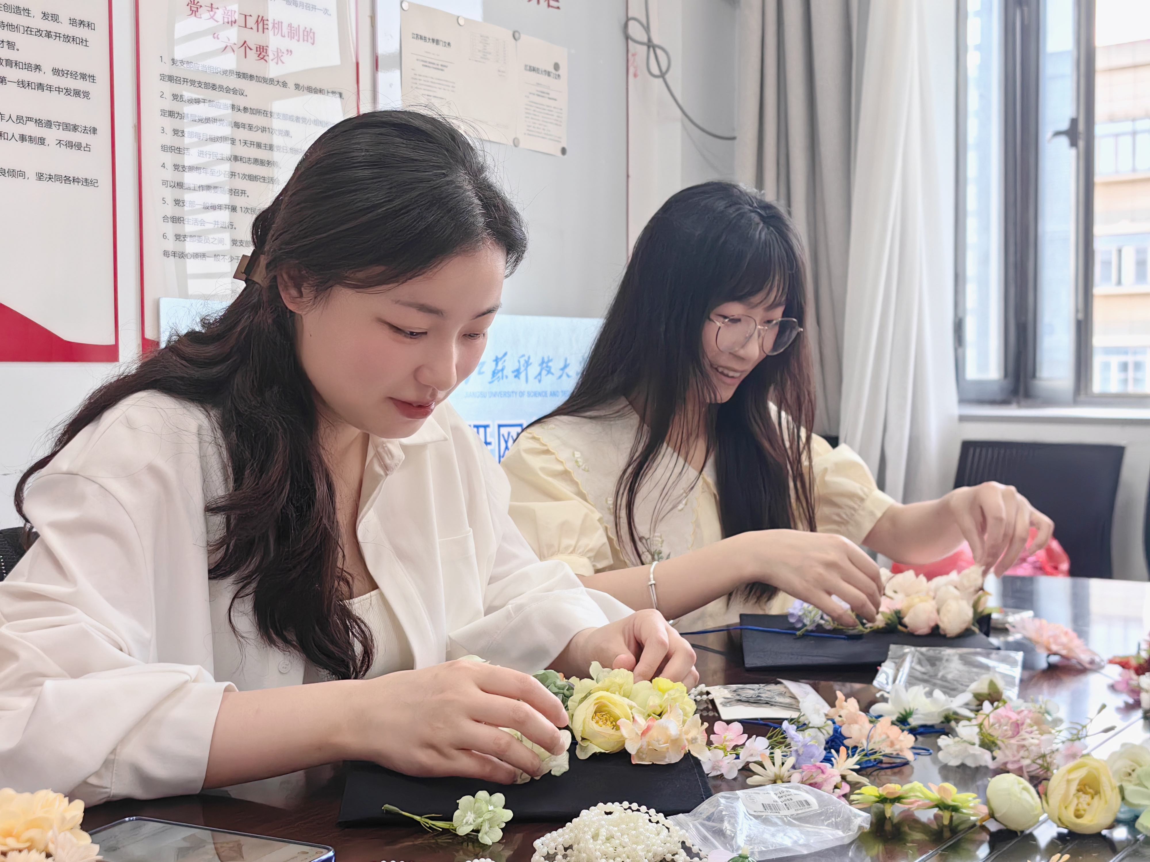 此次活动,学院准备了丰富的材料,包括各种颜色的装饰花朵、丝带、珍珠、蝴蝶等,供学生们自由发挥创意。活动现场,同学们围坐一堂,手持工具材料沉浸在簪花中。制作过程中,同学们纷纷发挥自己的想象力和动手能力,将各种材料巧妙地组合,制作出独具特色的硕士帽簪花。有的设计简约大方,有的则充满艺术气息,每一顶硕士帽都代表了同学们对母校的深深眷恋和对未来的美好憧憬。任小蝶同学表示,通过亲手制作硕士帽簪花,她自己更加珍惜在母校度过的时光,也更加期待未来的学术和生活旅程。