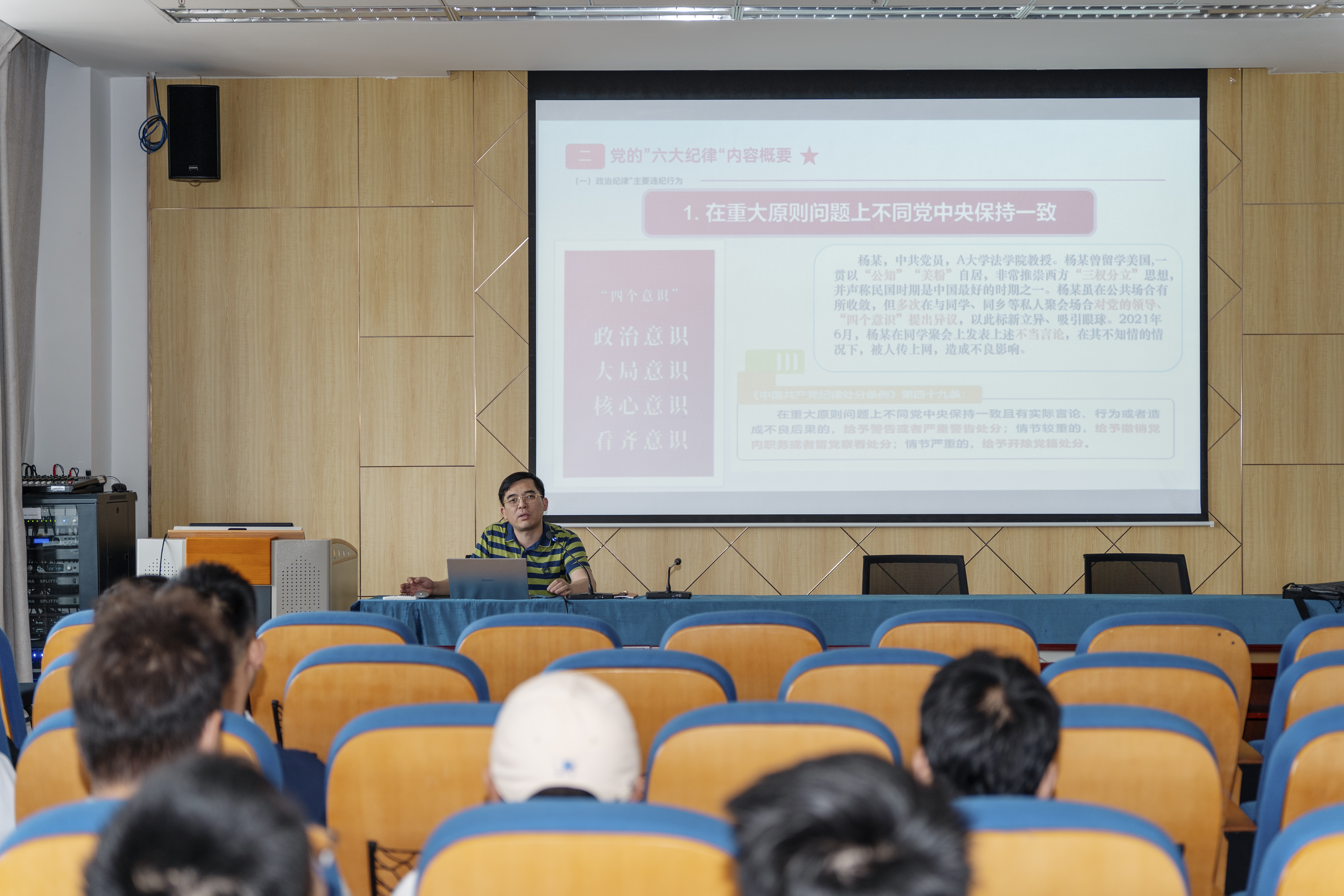 6月6日下午,院党委书记翟纯纯以《全面加强党的纪律建设为中国式现代化建设提供坚强纪律保障》为题,作党纪学习教育专题党课报告,学院党员师生代表参加党课学习。