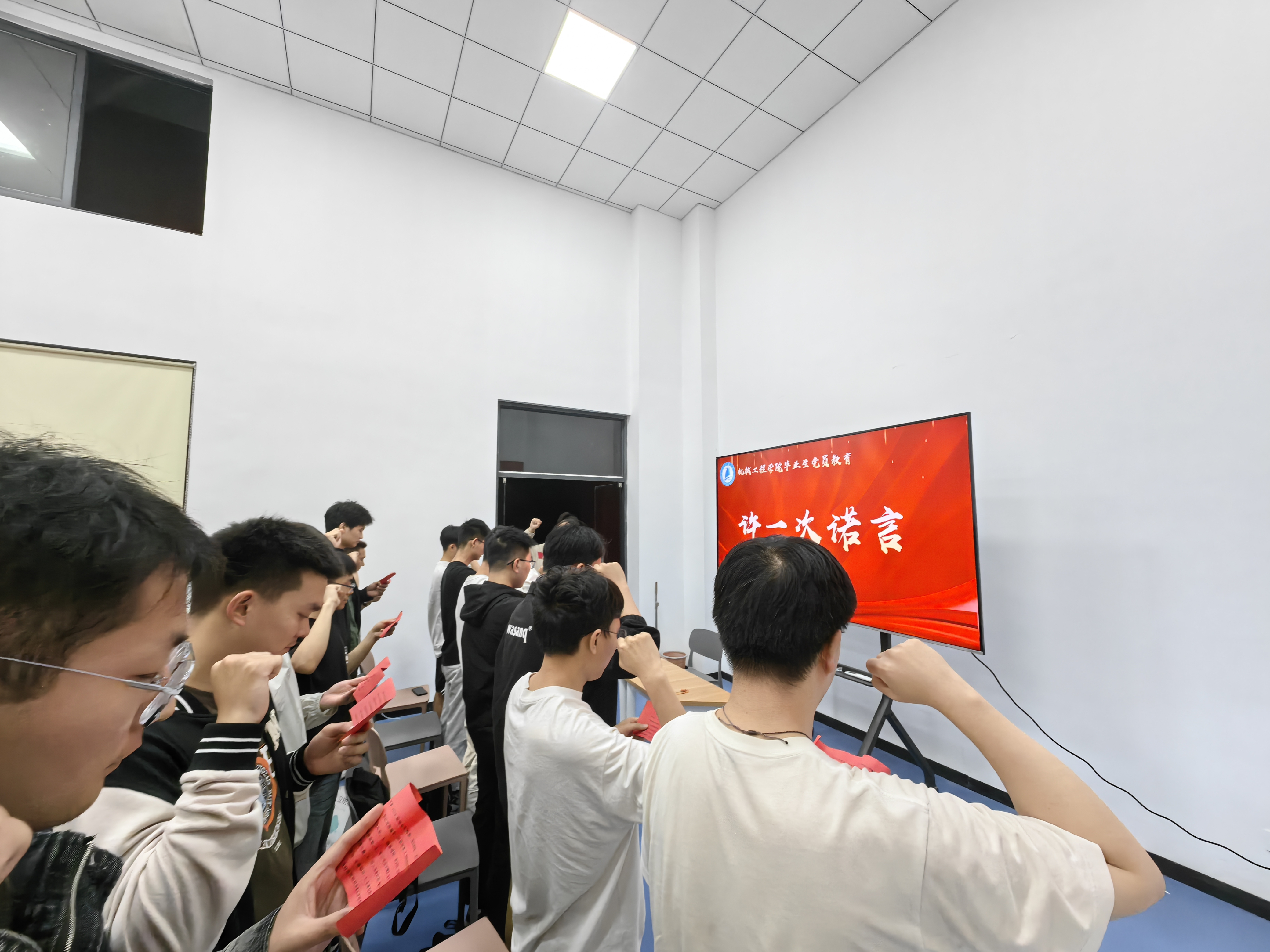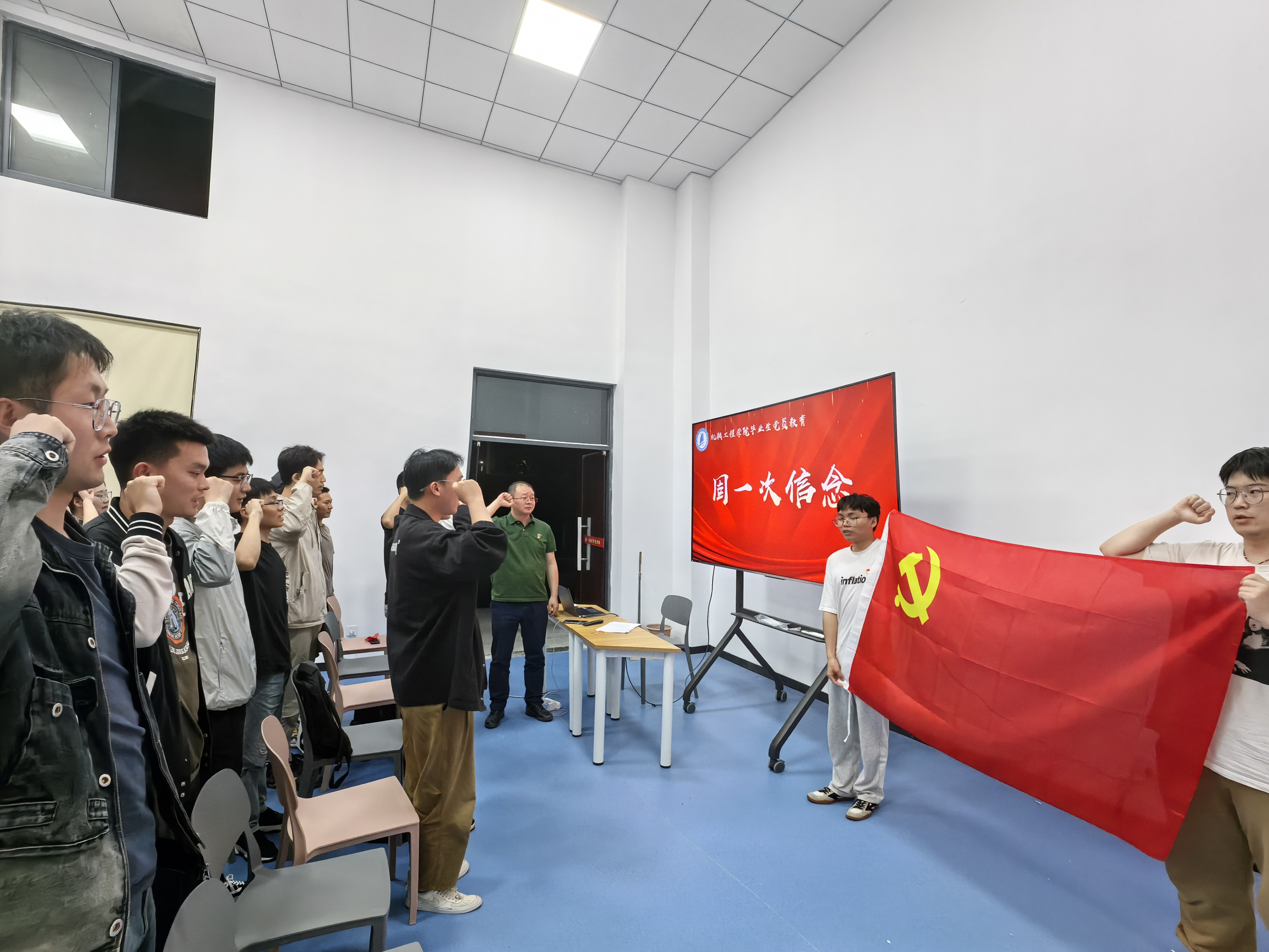 “固一次信念”。毕业生党员佩戴党员党徽,在党旗下重温入党誓词,向党再次表达他们的忠诚和决心,这不仅是初心和使命的再宣誓,更是接续奋斗的再出发。