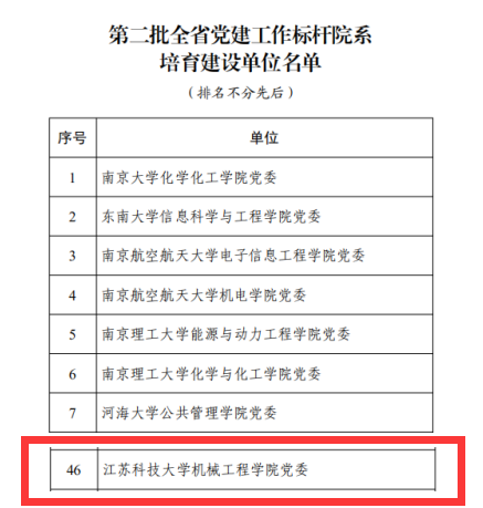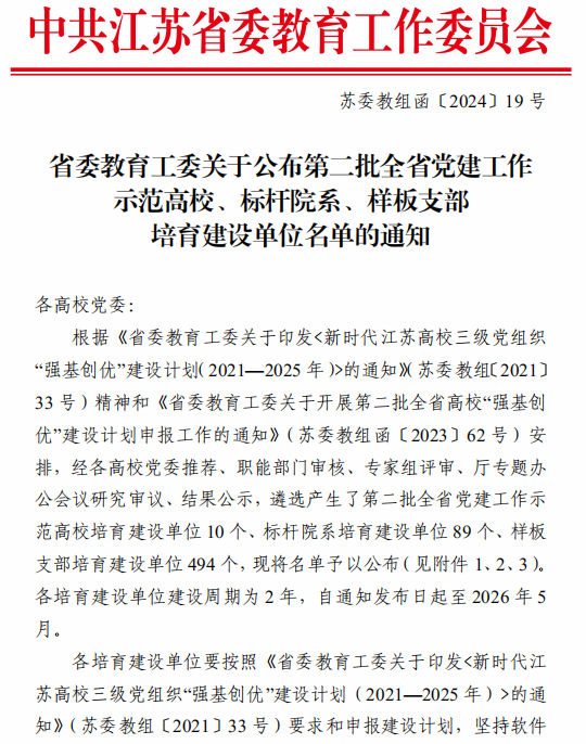 近日,江苏省委教育工委公布了第二批全省高校党建工作“标杆院系”“样板支部”培育创建单位名单,37266威尼斯党委获批省高校党建工作“标杆院系”培育创建单位。