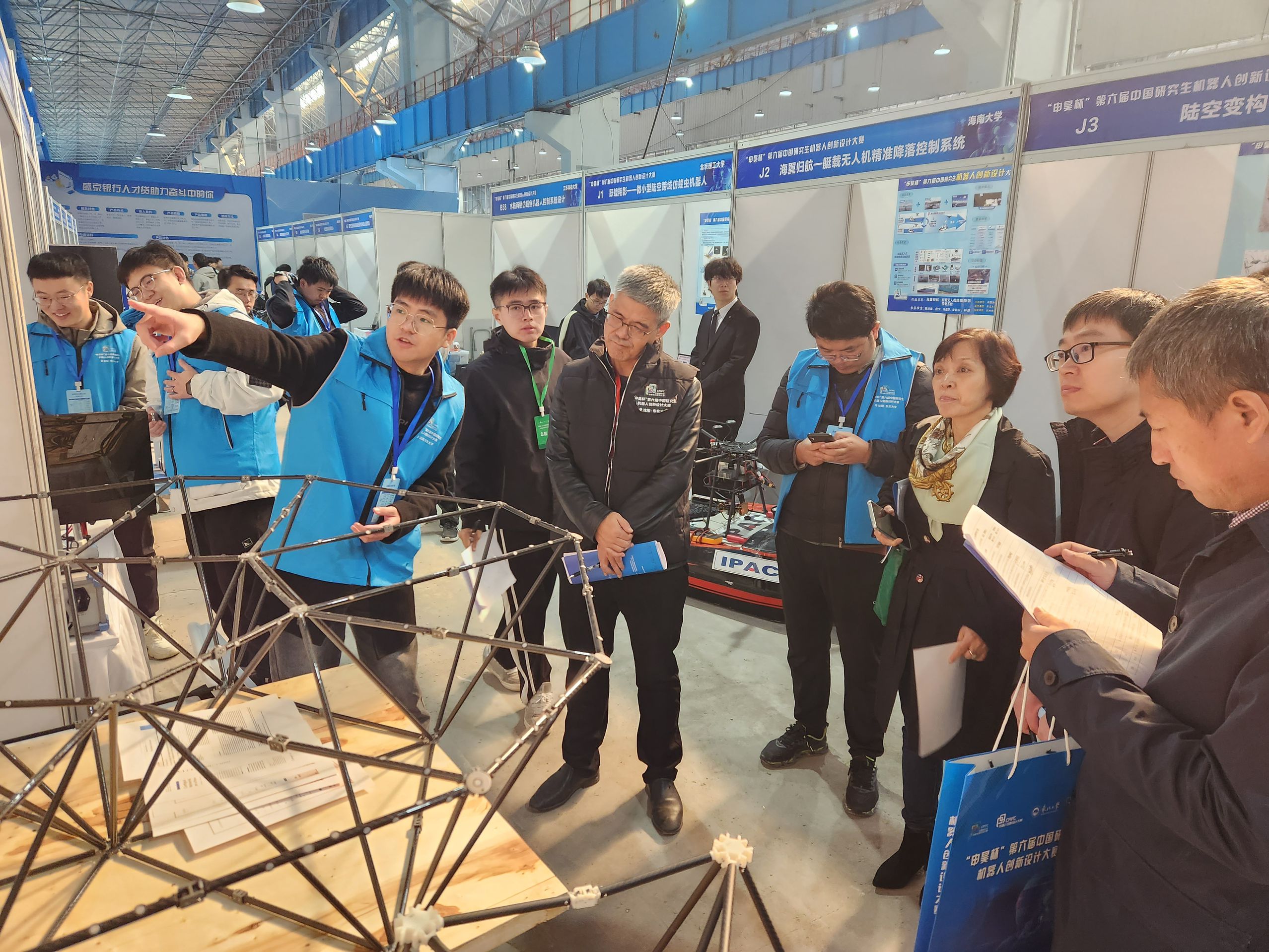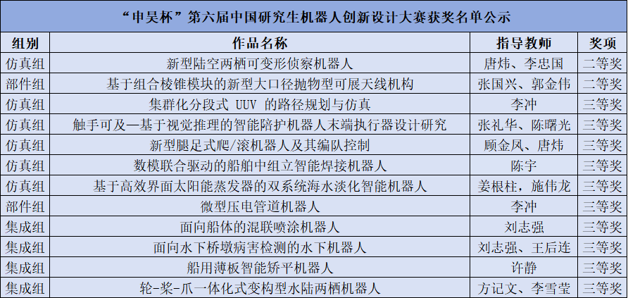 本次大赛中,我院推荐的12支参赛队伍(全校17支)在比赛中充分展示了扎实的专业知识和创新能力,以饱满的热情和精湛的技术,呈现了一场精彩纷呈的科研盛宴。其中,唐炜、李忠国老师指导李小林等同学完成的作品《新型陆空两栖可变形侦察机器人》和张国兴、郭金伟老师指导王杰等同学完成的作品《基于组合棱锥模块的新型大口径抛物型可展天线机构》斩获全国二等奖。李冲老师指导王平昶等同学完成的作品《集群化分段式 UUV 的路径规划与仿真》等10项作品荣获全国三等奖。