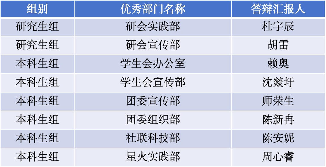 本次答辩会共有19个部门参与,从研究生组到本科生组,各部门负责人通过PPT的形式就过去一学期的工作成果进行了精彩展示与汇报。答辩现场,他们从学生工作出发,通过详实的数据、生动的案例,展示了一个学期以来部门在活动成果、团队建设、创新实践等方面的突出成绩。同时,各部门成员紧密配合,可以看到新鲜血液的加入为部门带来了更多的活力,彰显了团队的和谐氛围与开拓进取的精神风貌。