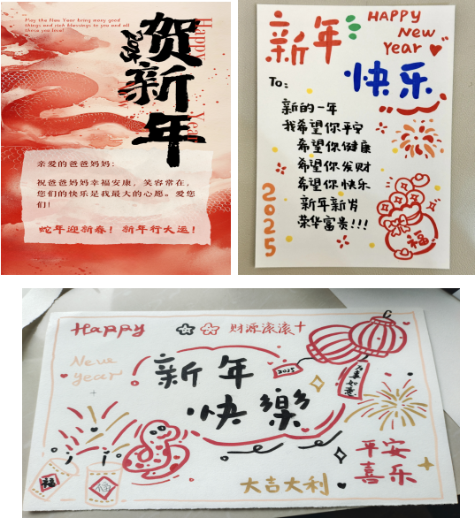 同学们积极参与祝福语征集和新年贺卡制作,每一份作品都充满了对老师、同学、家人和新年的美好祝愿。对联书写和窗花制作环节,更是展现了义工们的艺术才华和对中国传统文化的热爱。这些作品为节日增添了一份特别的喜庆。另外还录制了新年祝福视频,内容健康积极,不乏个人才艺展示,展现了当代大学生的青春风采。