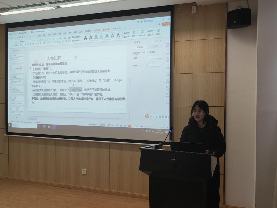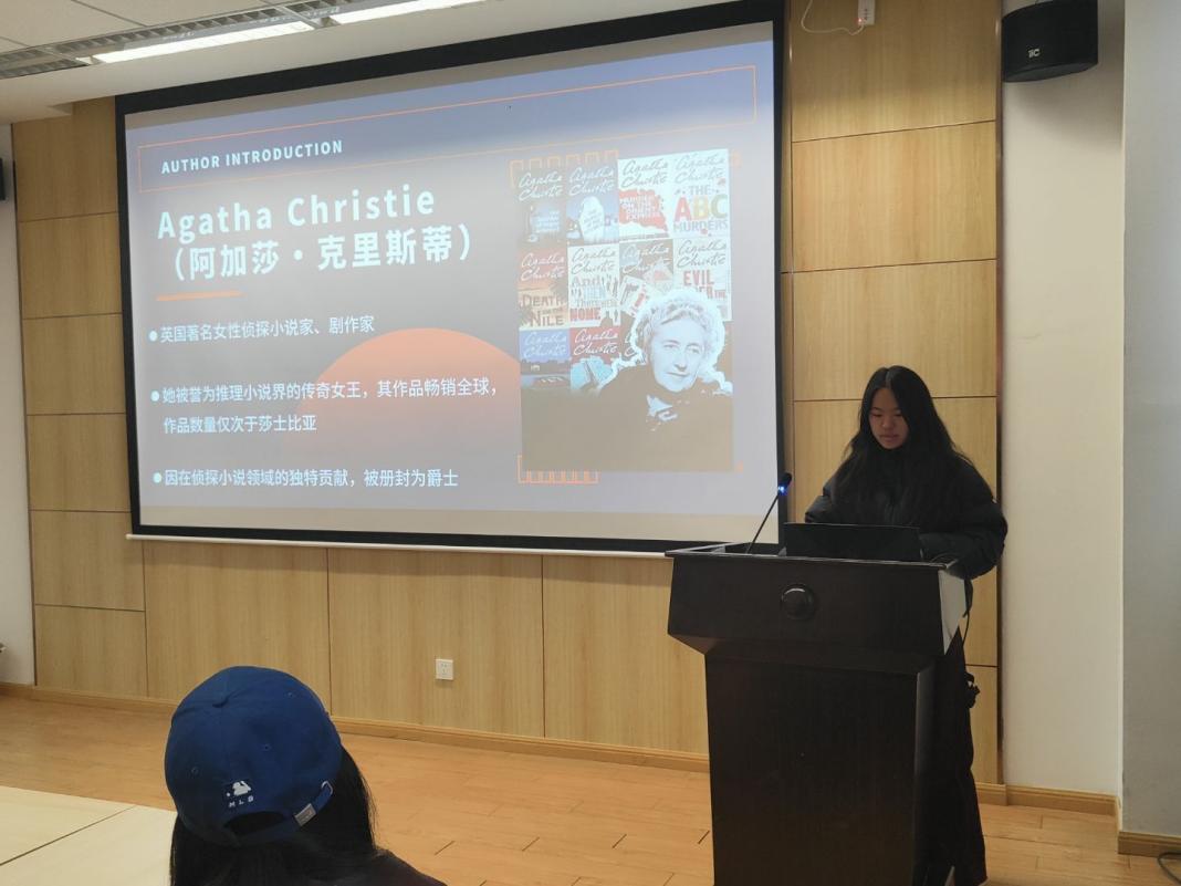 首先进行的是经验分享环节,本环节邀请了两位外国语学院的张凌宇同学和李成琳同学分享她们学习英语的经验和喜爱的英文著作。张凌宇同学用流利的英语向同学们分享了她喜爱的小说作家阿加莎·克里斯蒂,通过介绍经典著作的方法分享了阅读推理类英文作品对于英语理解的提升和逻辑思维能力的锻炼作用;随后上台的李成琳同学则深入解读了英文著作《红字》,从文学创作背景到人物内心剖析,李同学由浅入深的英文讲解配合PPT展示为同学们展现了小说中主人公精彩的一生。两位同学以文学作品作为切入点,用流利的英语口语配合生动的演讲展现了深厚的英文文学功底,分享了文章阅读理解的思路和方法,启发了同学们对英文作品的理解思路。