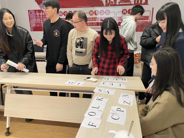 经验分享结束后,趣味游戏环节将活动推向高潮。“单词接龙”考验同学们的词汇量和反应速度,失败则进行英文自我介绍锻炼了英语口语表达;“组内信息挑战”游戏将英语学习融入交友互动,锻炼语言表达能力和记忆力;“字母拼单词”游戏需要充分发挥各自的词汇储备和创造力;“听歌识曲”游戏将音乐与英语巧妙结合,既考验了同学们的英语听力,又让大家在轻松愉快的氛围中感受音乐的魅力。