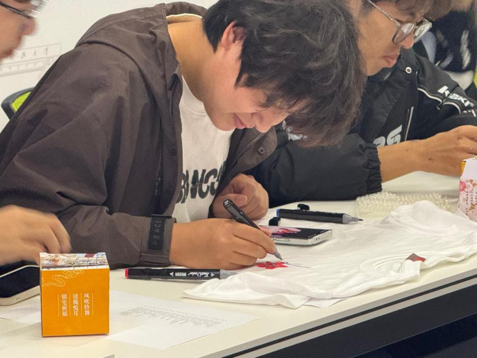 活动现场洋溢着青春跃动的气息,设计同学进行头脑风暴、物料同学甄选颜料画笔、绘制同学屏息凝神地在白布上勾勒灵动的轮廓。片刻后,一件件独具匠心的白色T恤衫诞生了,从充满梦幻色彩的星空图案,到极具艺术感的抽象线条,再到承载美好祝愿的文案,每一件白色T恤衫都珍藏着属于这个春日的独家记忆。