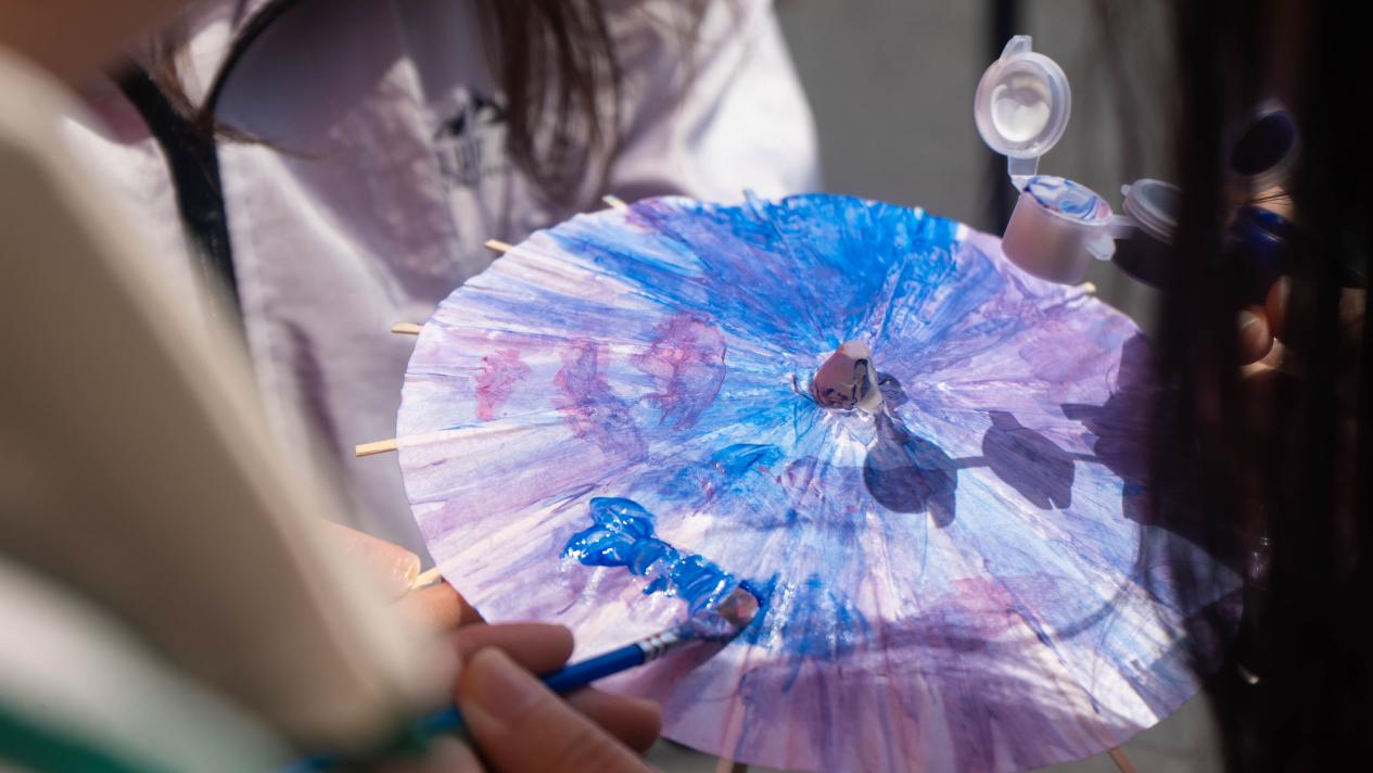 油纸伞既是遮雨工具,亦承载着“驱邪避晦”的民俗寓意。创作区内,同学们拿起颜料和画笔在伞面上勾勒出五彩斑斓的图案。一枝梅花,一个动漫人物,亦或是一只小狗在同学们的创作下跃然于伞面,线条与色彩碰撞展现春天的活力,传统与创新交融绘就油纸伞的新章。这次跨越时空的对话,让古老工艺在创新表达中重获新生,使民俗记忆通过青春笔触得以延续。