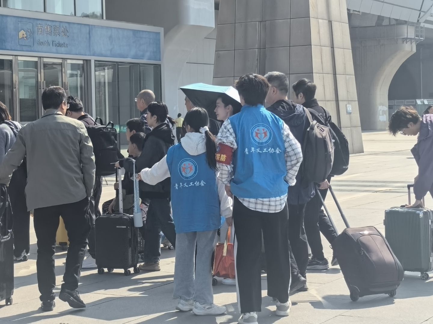 第二组负责秩序维护。针对高峰时段人流集中现象,义工们协同工作人员设置临时分流通道,通过举牌提示、广播提醒等方式,引导旅客有序排队。