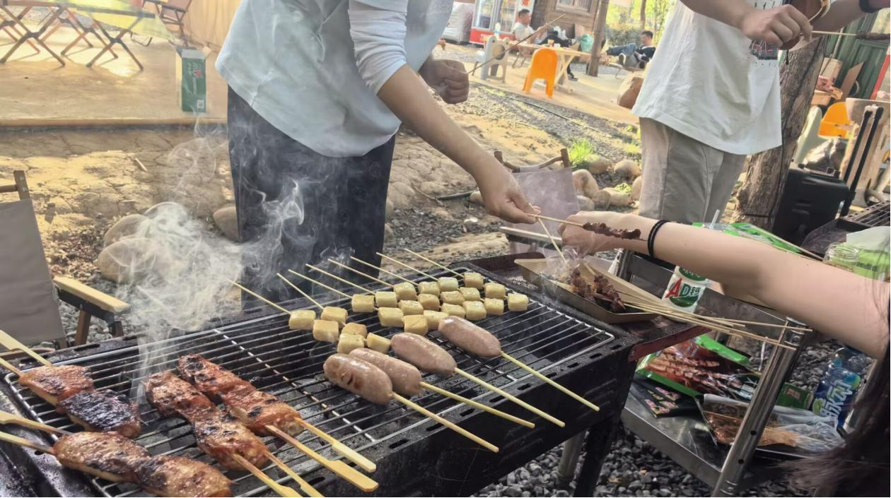 炭火噼啪作响,肉香裹挟着欢声笑语在帐篷外升腾。烧烤作为本次团建的重头戏,成了同学们情感升温的催化剂。大家默契配合翻转食材,香肠在火苗上滋滋冒油,油花溅起的微光里,既有舌尖上的满足,更有协作无间的情谊。这场味觉与心灵的双重盛宴,让团队凝聚力在烟火气中悄然凝聚。