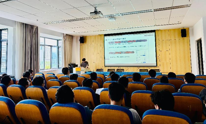 之后,苏傲成同学则以学科竞赛为切入点,详细介绍了竞赛的参赛流程与备赛策略。他以自己参加的挑战杯为例,从选题立意、团队分工、技术方案设计到答辩呈现进行了复盘,在案例分享环节,他展示了获奖项目的技术路线图与成果展示视频,生动诠释了“从理论到实践”的转化过程。他鼓励研一、研二同学:“竞赛不仅是荣誉的角逐,更是解决问题能力的锤炼。”
