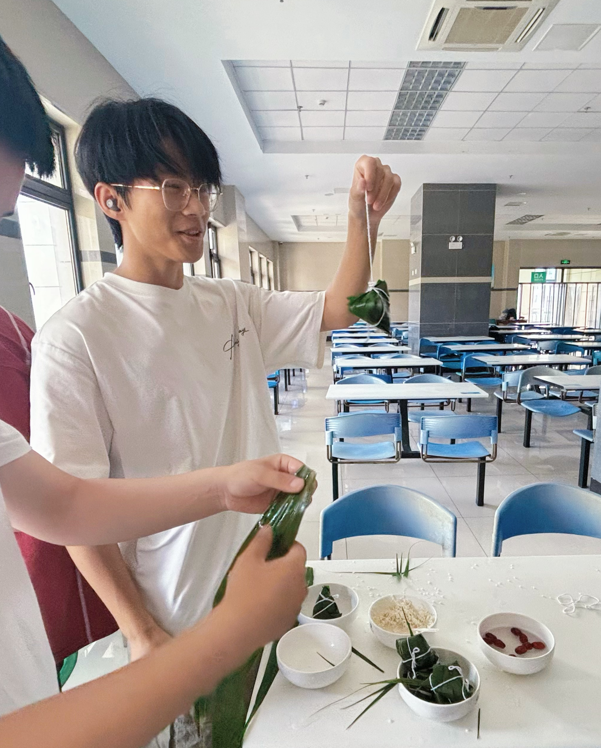包粽子过程中,来自五湖四海的同学们热情分享家乡端午习俗:编五彩绳寄托驱邪纳吉的期许,特色肉粽裹着独特的地域风味,挂艾叶的传统里藏着驱蚊避疫的智慧,自制香囊则氤氲着草木清香…… 大家边交流边动手,粽叶翻飞间,一盘饱满的粽子在欢声笑语中新鲜“出炉”,现场洋溢着浓浓的节日氛围。